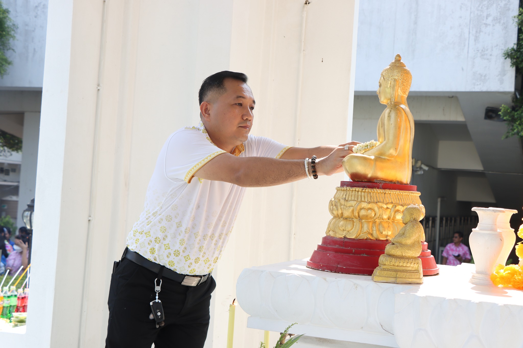 จากนั้นเวลา 10.39 น. ณ ห้องประชุมพระนารายณ์ ชั้น 4 อาคารรัตนเทพสตรี พระสงฆ์ จำนวน 9 รูป รับทักษิณานุปทานอุทิศส่วนกุศลให้แก่อดีตอธิการบดี บุคลากร นักเรียน และนักศึกษาผู้ล่วงลับ, พิธีเจริญพระพุทธมนต์ ถวายภัตตาหารปิ่นโต และถวายเครื่องไทยธรรมแด่พระสงฆ์ โดยมหาวิทยาลัยได้รับความเมตตาจากพระครูสิริจริยาภรณ์ เจ้าคณะอำเภอเมืองลพบุรี เจ้าอาวาสวัดเสาธงทอง พระอารามหลวง ให้เกียรติเป็นประธานฝ่ายสงฆ์ โอกาสนี้ หลังเสร็จสิ้นพิธีสงฆ์ ผศ.ดร.กันยา บาร์นท์ อธิการบดีมหาวิทยาลัยราชภัฏเทพสตรี ได้กล่าวอวยพรเนื่องในโอกาสประเพณีวันสงกรานต์แก่ผู้ร่วมงาน พร้อมทั้งได้นำผู้บริหาร บุคลากร และแขกผู้มีเกียรติ ร่วมสรงน้ำพระพุทธรูป และรดน้ำขอพรอาจารย์-บุคลากร อาวุโสและผู้ใหญ่ที่ให้ความเมตตากับมหาวิทยาลัย สร้างความเป็นสิริมงคลอันเป็นการเริ่มต้นปีใหม่อย่างมีความสุข