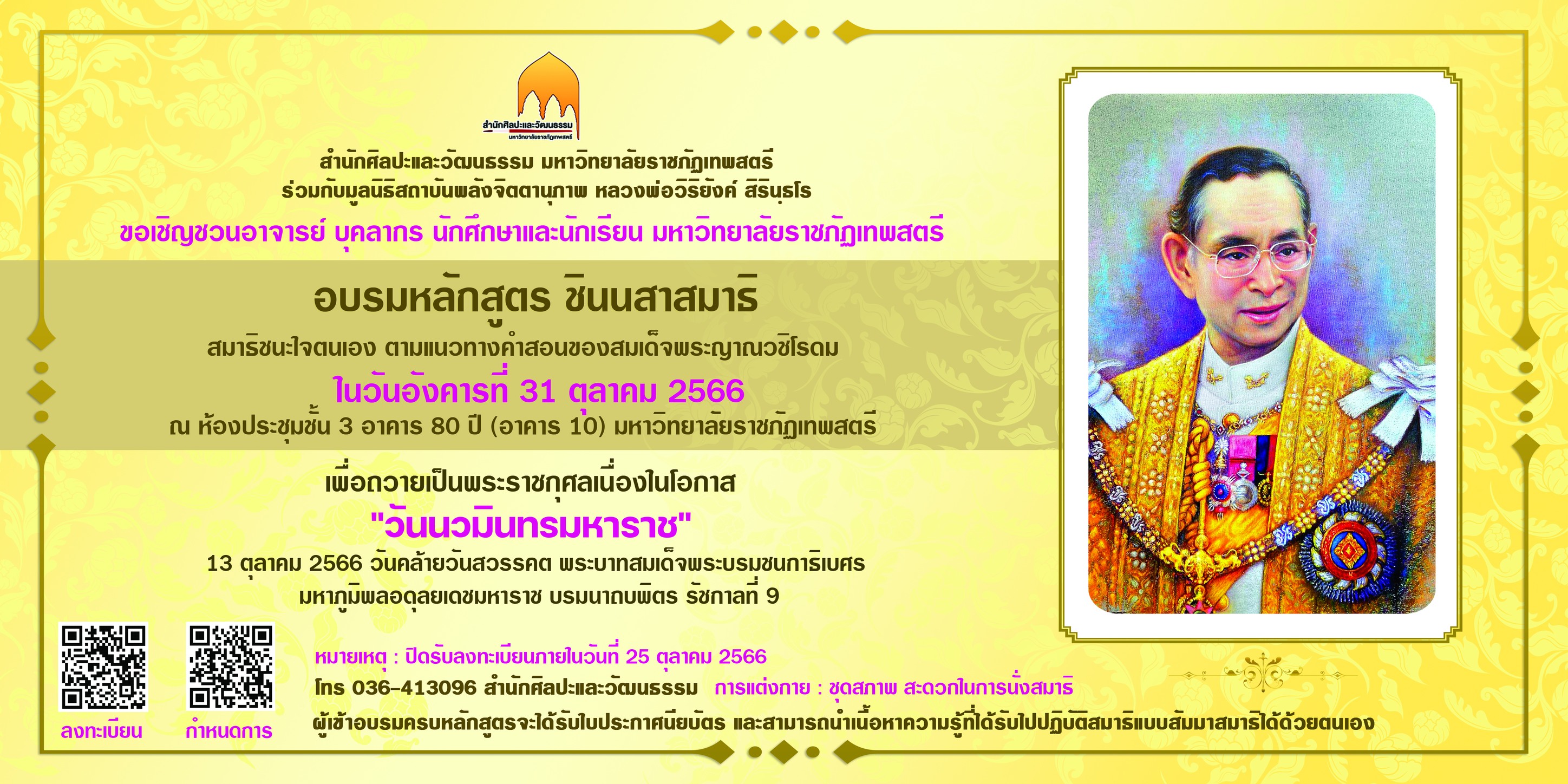 ขอเชิญชวนอาจารย์ บุคลากร นักศึกษาและนักเรียน มหาวิทยาลัยราชภัฏเทพสตรี อบรมหลักสูตร ชินนสาสมาธิ สมาธิชนะใจตนเอง ตามแนวทางคำสอนของสมเด็จพระญาณวชิโรดม เพื่อถวายเป็นพระราชกุลเนื่องในโอกาส "วันนวมินทรมหาราช" 13 ตุลาคม 2566 วันคล้ายวันสวรรคต พระบาทสมเด็จพระบรมชนกาธิเบศร มหาภูมิพลอดุลยเดชมหาราช บรมนาถบพิตร รัชกาลที่ 9 ในวันอังคารที่ 31 ตุลาคม 2566 ณ ห้องประชุมชั้น 3 อาคาร 80 ปี (อาคาร 10) มหาวิทยาลัยราชภัฏเทพสตรี