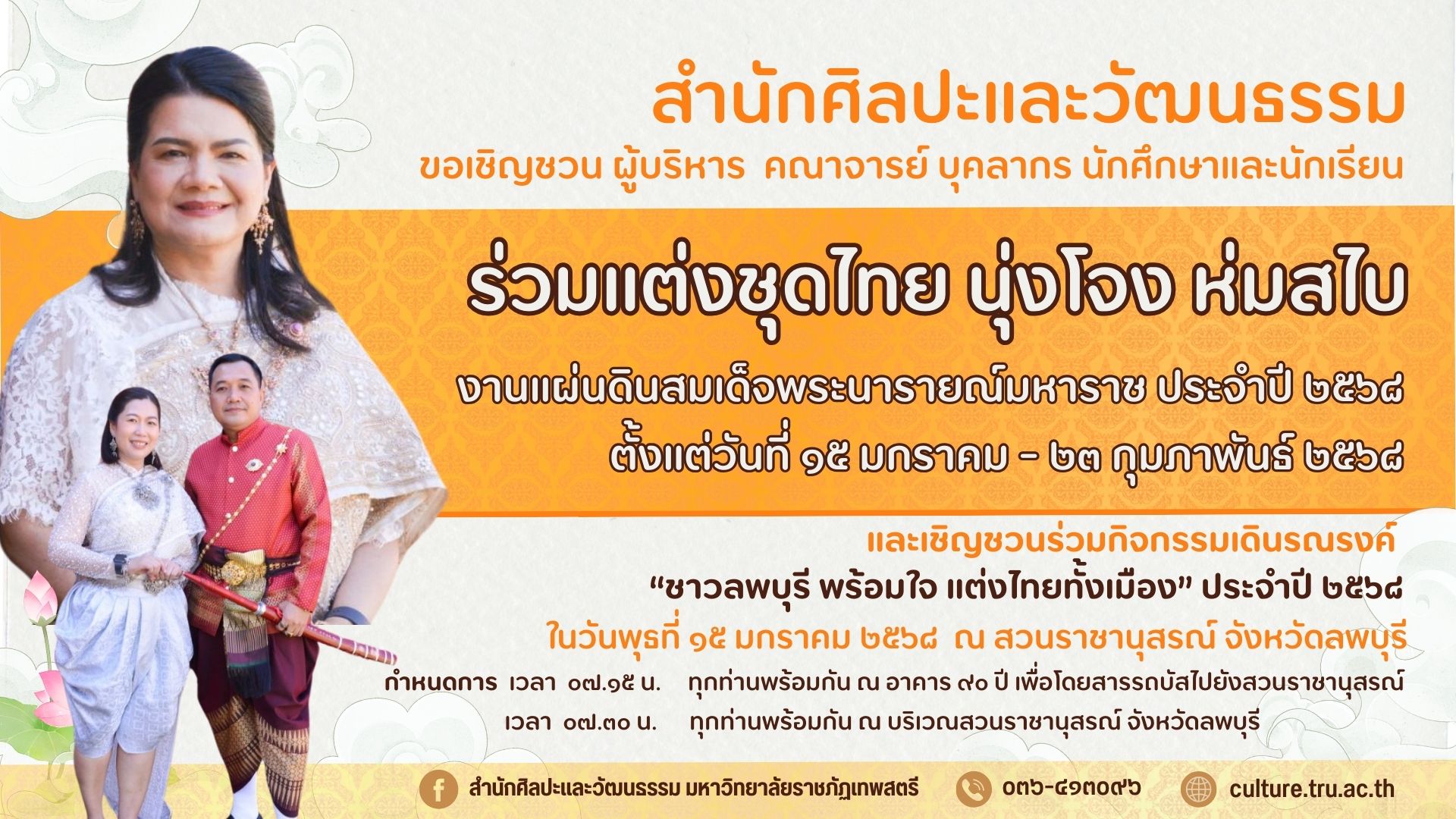สำนักศิลปะและวัฒนธรรม ขอเชิญชวน ผู้บริหาร คณาจารย์ บุคลากร นักศึกษาและนักเรียน ร่วมแต่งชุดไทย นุ่งโจง ห่มสไบ งานแผ่นดินสมเด็จพระนารายณ์มหาราช ประจำปี 2568 ตั้งแต่วันที่ 15 มกราคม - 23 กุมภาพันธ์ 2568 และเชิญชวนร่วมกิจกรรมเดินรณรงค์ ในนามมหาวิทยาลัยราชภัฏเทพสตรี “ชาวลพบุรี พร้อมใจ แต่งไทยทั้งเมือง” ประจำปี 2568 ในวันพุธที่ 15 มกราคม 2568 ณ สวนราชานุสรณ์ จังหวัดลพบุรี