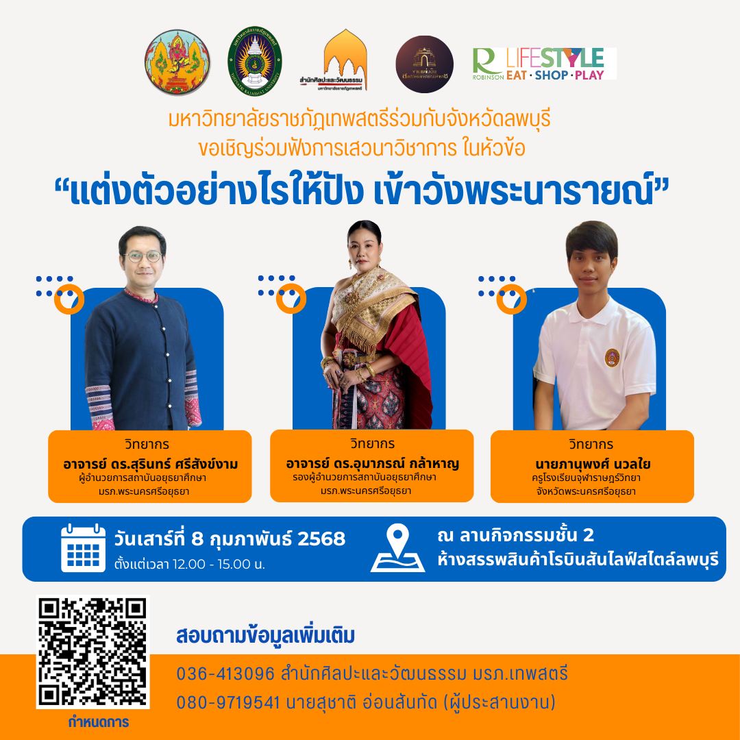 มหาวิทยาลัยราชภัฏเทพสตรีร่วมกับจังหวัดลพบุรี ขอเชิญร่วมฟังการเสวนาวิชาการ ในหัวข้อ “แต่งตัวอย่างไรให้ปัง เข้าวังพระนารายณ์” ซึ่งกิจกรรมนี้เป็นส่วนหนึ่งในงานแผ่นดินสมเด็จพระนารายณ์มหราช ครั้งที่ 37 ประจำปี 2568 ในวันเสาร์ที่ 8 กุมภาพันธ์ 2568 ตั้งแต่เวลา 12.00 น. เป็นต้นไป ณ ลานกิจกรรมชั้น 2 ห้างสรรพสินค้าโรบินสันไลฟ์สไตล์ลพบุรี จัดโดย สำนักศิลปะและวัฒนธรรม มหาวิทยาลัยราชภัฏเทพสตรี